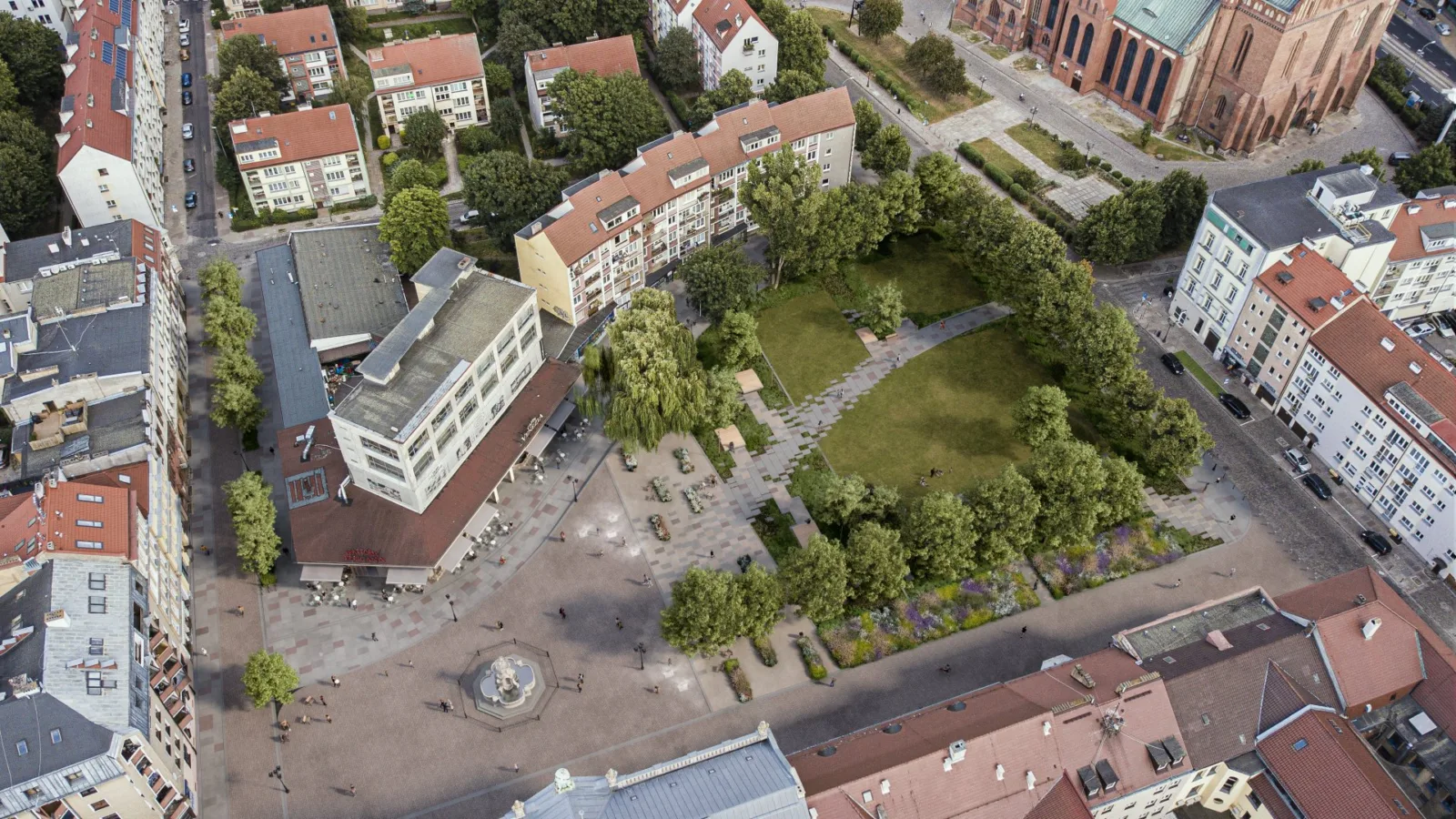 - utwardzona część północną Placu Orła Białego na szerokość Pałacu pod Globusem z centralnym punktem w postaci fontanny – zapewniająca dogodne warunki na organizację wydarzeń społecznych i kulturalnych oraz obsługę lokali użytkowych w parterach;